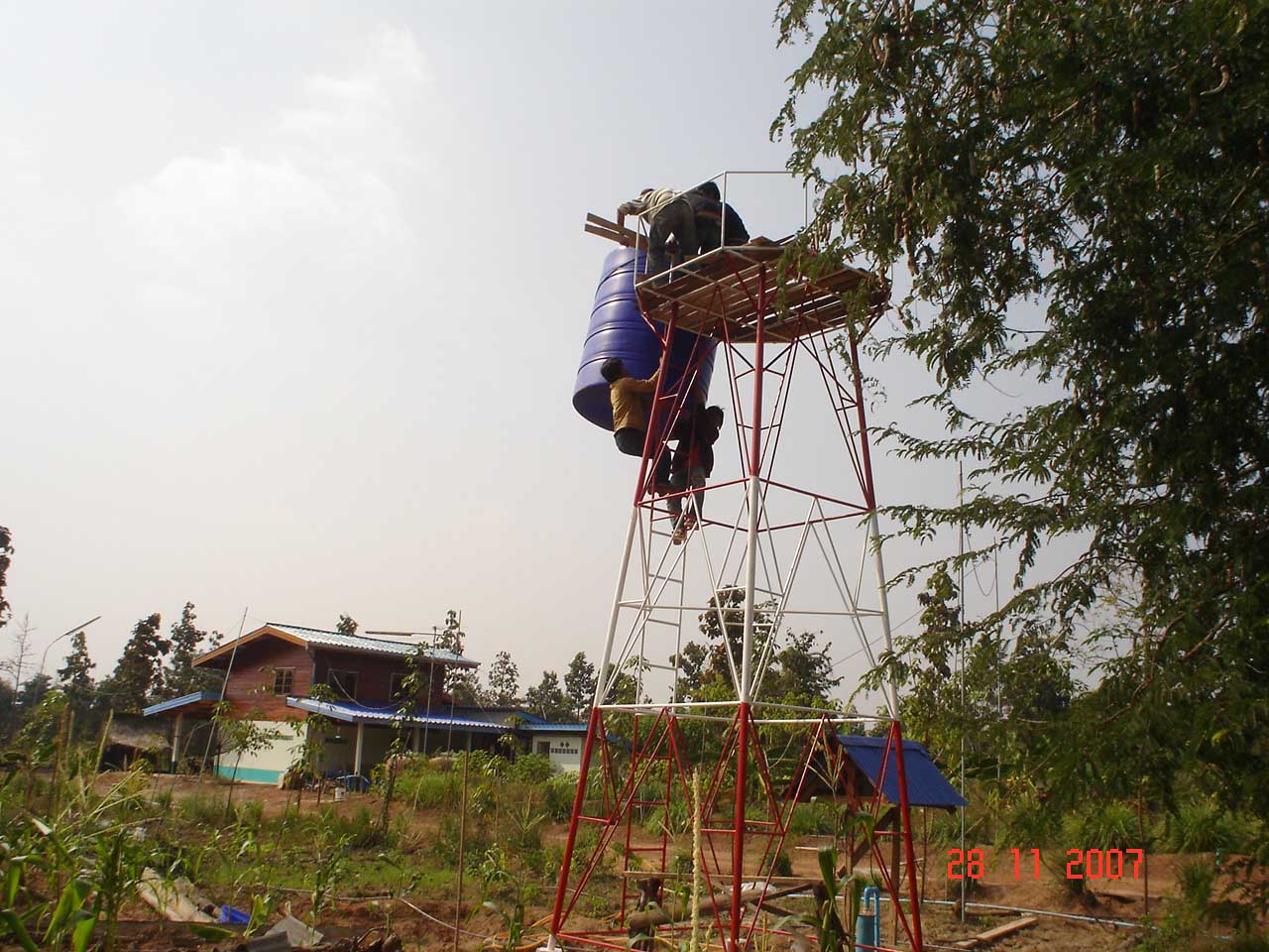 ให้คนเอาถังน้ำขึ้นหอพักน้ำ บรรจุน้ำ 2,000 ลิตร (ถังซื้อที่ อ.บ้านไผ่
