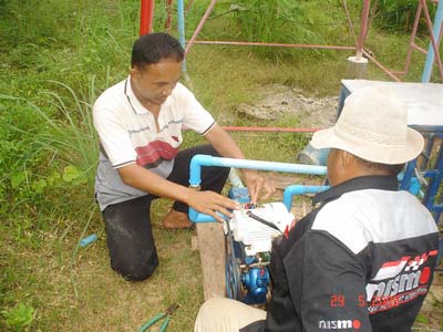 29/05/2551 ติดตั้งเครื่องสูบน้ำและต่อสายไฟที่ลงมาจากตัวผลิตไฟฟ้า (Generator) เข้ากับไดนาโมของเครื่องสูบน้ำเพื่อดึงน้ำขึ้นจากบ่อบาดาล พอลมมาใบพัดก็จะหมุน จะได้พลังงานไฟฟ้า 380 โวลล์ ฉุดมอเตอร์ให้หมุน ดูดน้ำขึ้นจากบ่อบาดาลใช้ในครัวเรือนและรดน้ำต้นไม้ในสวนครับ "พลังงานธรรมชาติ ประหยัดช่วยชาติ"